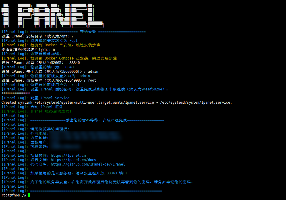 到这里 1Panel 的安装就完成了,注意查看日志,外网地址,内网地址,面板用户,面板密码